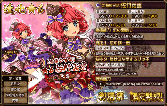 とろけるお味のちょこれーとで織田家の皆さんの心をわしづかみっ! ……でも味見と称してちょっぴり食べ過ぎてしまって、お腹周りが気になっているんだとか……! ほ、本人に言ったらダメですよっ! あっ、神化ではせくしーな鬼の姿で大人の魅力が垣間見えちゃいますよっ! #戦プロ