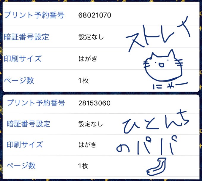 取り敢えずネップリで登録したので貼っときます。2種類あるので間違えないようにね サイズはハガキでリサイズしたので店舗が対応してなかったらすみません〜 白背景がセブン(6日間)、紺背景がファミとかローとか(7日間)です。印刷まだしてないのでどうなるかは知らぬ 個人で楽しんでね〜