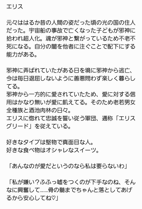 @Ryuto_U_01 フォローありがとうございます。 現在は小説媒体での活動は無く、基本的にはイラストやツイートで会話呟くみたいな感じでオリトラ活動してます。エリスちゃの設定は以下の画像になります🙌🙌🙌