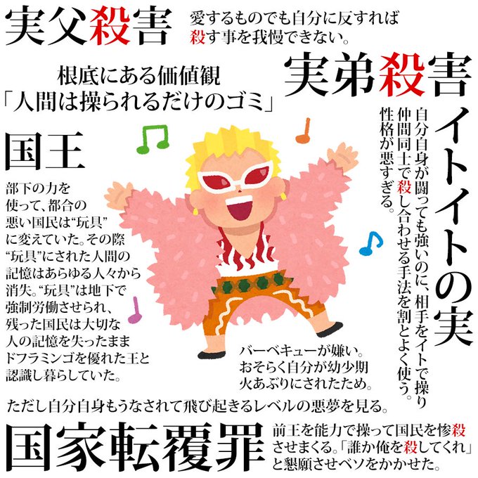 今日から9/2までワンピース62〜90巻無料らしいので、ドレスローザ とドフラミンゴのステマ画像を載せておきます。(独断と偏見を含む個人の意見です/一部いらすとや使用/ネタバレあり) エース死亡あたりで脱落した人が読むのに丁度いいと思います。