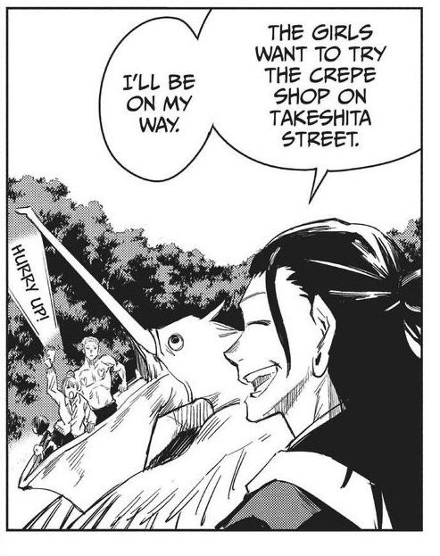 realized that when nobara is introduced in the anime, they’re on takeshita street and they show the crepe shop that getou took nanako and mimiko to—and the girls in the anime look so reminiscent of them 😭