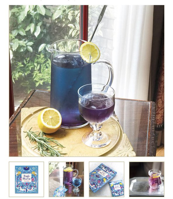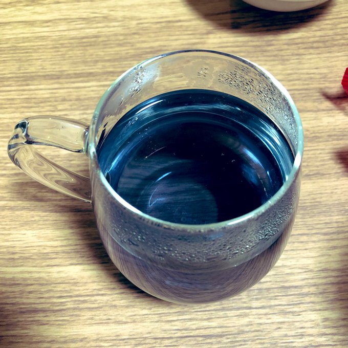 今飲んでる紅茶がとても青くて綺麗。ちなみにレモンを入れると紫色になるそうです。うつくし〜