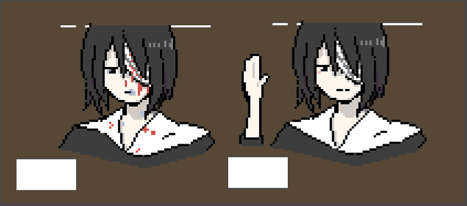 アクションゲームに使おうとしていた食らいグラが出てきた。残機が減るごとに血みどろになり、回復するとちょっとマシになる。残機五つで、左がラスイチ、右が残り三。なんていうか、描いてたときも薄々思って排他が、十年近く経った今でも趣味悪いな……という気持ちがある。気に入ってはいるのだが…