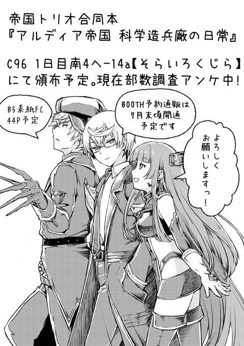 【C96新刊】アルディア帝国科学造兵廠の日常【サンプルするめside】 アルディア帝国合同本原稿あがりましたー! 仕様:B5表紙FC/44P/ゲスト2名様