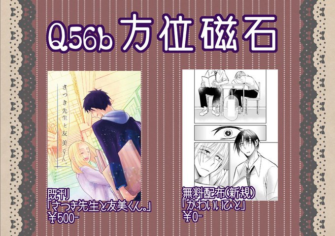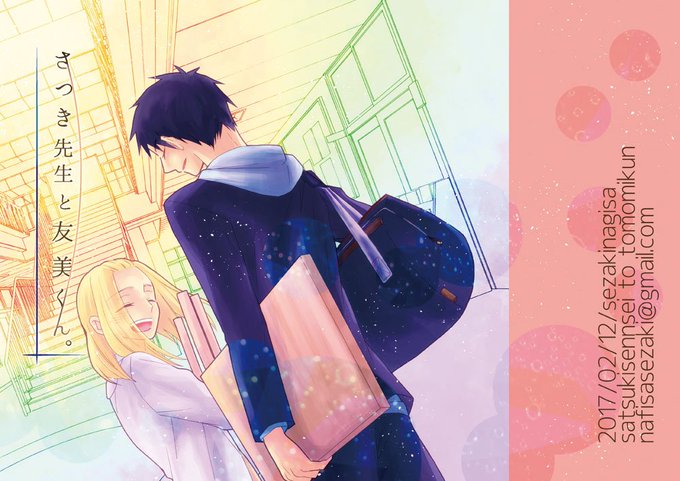 新しいのはふわっとBLな8ページ無配マンガ、既刊はティアズマガジンのプッシュ&レビューにも紹介していただいている「さつき先生と友美くん。」です。