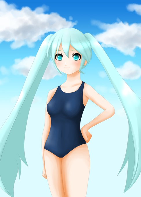 ミクさんにスクール水着を着せてみたよー! 今回は線を細めに描くのに挑戦したみました☺ #初音ミク