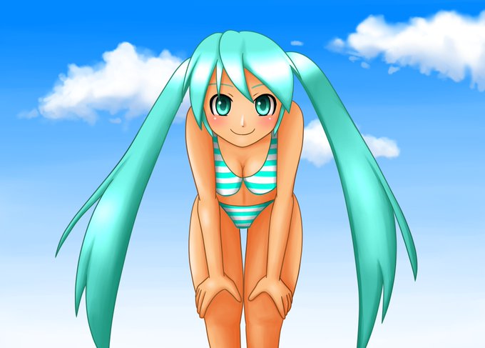 水着姿のミクさん描いてみました👙 前屈みのポーズの練習です😀 #初音ミク