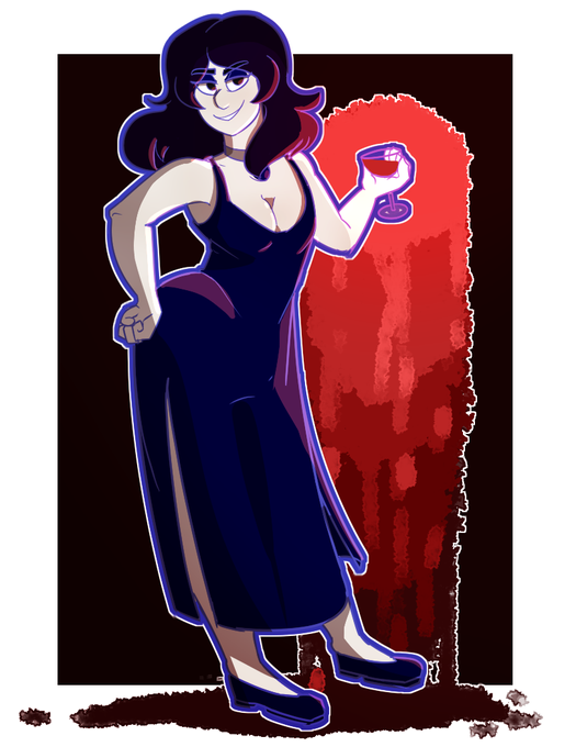 A fullbody piece of their wonderful, beautiful oc, Giselle! Trust me, pal (and you really gotta trust me on this one), that red stuff in her glass? That aint wine. Aint tomato juice neither 👀