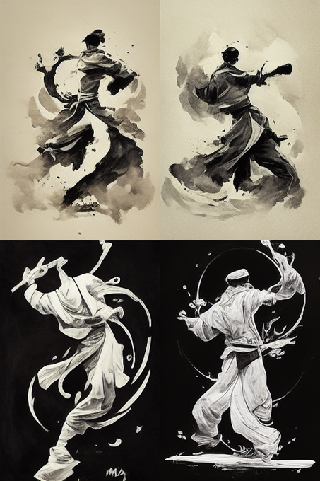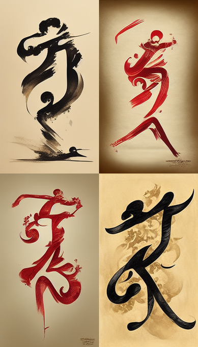 カンフーの達人 + ①カリグラフィ風/ ②水墨画風/ ③山水画風
