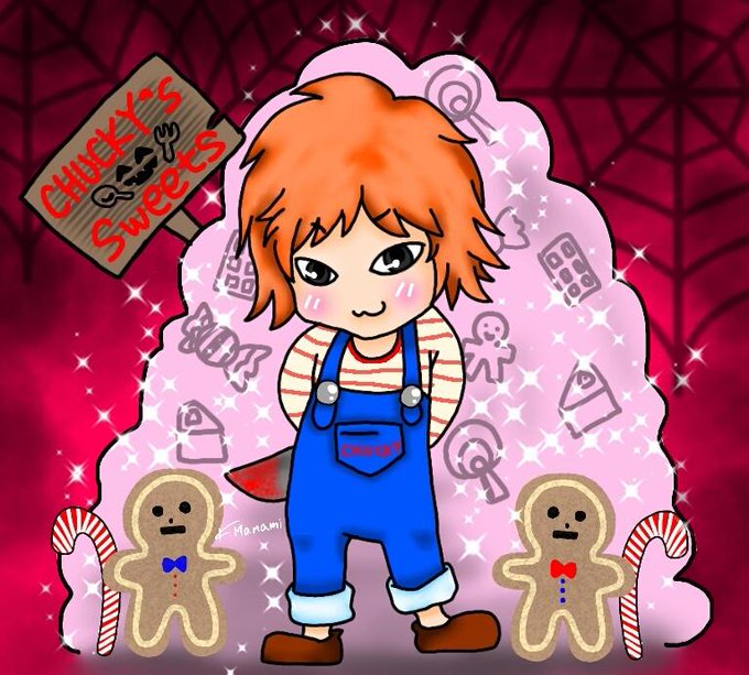 Fanart Trick or Treat! チャッキーソンに、お菓子をあげないとイタズラされちゃうよ😁後ろのお菓子の山から、お菓子をとると追いかけ回されちゃうから気を付けてね💙 #superjunior #yesung .