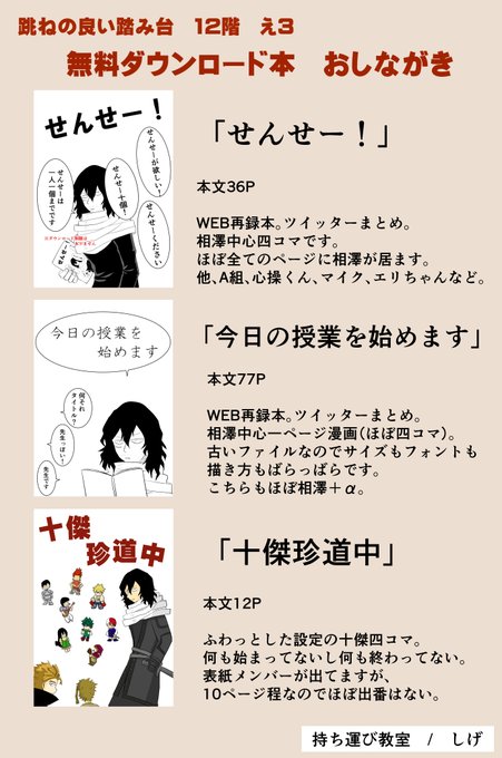 #跳ね台お品書 お品書きできましたー。 無料DL本3冊。十傑本はあとでpixivやツイッターに載せるかもしれないし載せないかもしれない。 サークルカットも修正。多分これで最終かな…。
