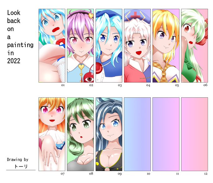 2022年もあと3ヶ月足らずか… 一応ここまでの月間最多ブクマ数(Pixiv)で並べて見た 5月は蓮メリコンビだったので2パターン #絵師進化録 #チルノ #古明地さとり #雲居一輪 #八意永琳 #宇佐見蓮子 #マエリベリー・ハーン #上白沢慧音 #クラウンピース #山城たかね #姫虫百々世