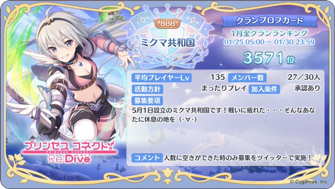 2月のクラメン募集します! 初心者の方から玄人の方までどなたでも大丈夫です! ・クラバトは1日2凸以上(3凸できる人は3凸) ・自由凸です ・クラチャ(ツイッターのグルチャ)でワイワイしたい人大歓迎!