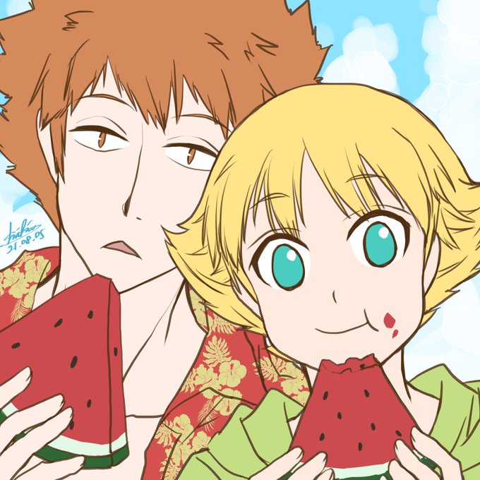 生駒隊なんですが隠岐くん描けないので大好きな海くんとみずかみんぐで描かせて頂きました🙏✨ スイカ食べたくなりました🤤 シンプルイズベストということで。みんぐ、アロハ似合いすぎて笑いましたw