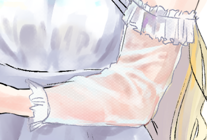 透け袖の塗り方をいつもと変えてみた。①透け袖レイヤーにえいやっと腕を塗る②上にレイヤーを作り透け布が重なって不透明になってる部分と影を塗る(わかりやすいように用紙の色を綠にしてます)③腕の線画をぼかす④質感合成