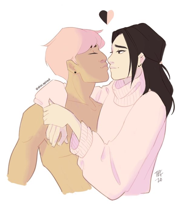 @waschbaerella lee ho code name leo (left, the mindchild of my partner) and namshin code name shin (right). they were childhood friends and had a crush on each other from afar. they met later in life bc leo debuted as a kpop idol and shin happened to be a new makeup artist at his company 😳