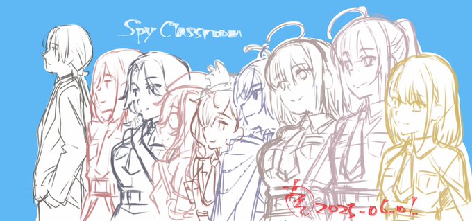 今月発売のスパイ教室13巻が楽しみ。クラウスさん表紙でみんなの新デザインが出揃ったから、前に放送終了のときに描いたの合わせでざっと描いてみたり。また時間できたらちゃんと清書しようかな。久しぶりに描いたけどやっぱり楽しいなぁ。チーム物は良い。 #スパイ教室FA