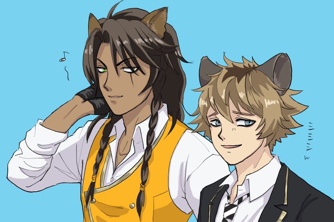 #ローディング画面に出た4人を描く テンプレお借りしました。 🐉vs🦁に挟まれてキョドる💀に対し寮長3人に囲まれても全く動じない🦈
