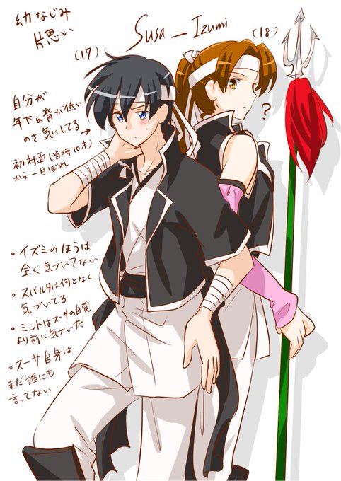 スサイズは、同じ部隊に属する副隊長スーサと、隊長の妹であるイズミ。スーサのほうが年下で、イズミに片想い中。周りにはバレバレのわかりやすい好意ですがイズミのほうは鈍感で気づかず、幼馴染なので弟分的な扱い。スーサはヘタレなので告白未遂が数回あるだけで想いを伝えられていません。頑張れ…