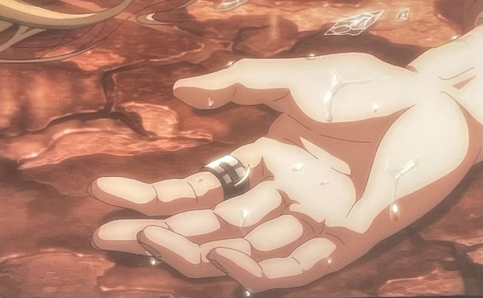 指輪の棘が出しっぱなしになっている。 「慈悲」の回でアニが指輪の中にある棘で自傷行為をし、巨人化。その後すぐに水晶体に閉じこもるため、アニは棘を指輪の中にしまう時間がなく、ずっと出しっぱなしの状態だった。 #shingeki #進撃の巨人