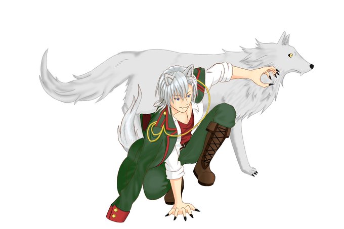やっっっと描けた…狼獣人の子✨ 放置しすぎた💦 名前は光(コウ)・グリージオ。 灰色の光って意味になります!! 後ろの狼は獣化した姿 #創作