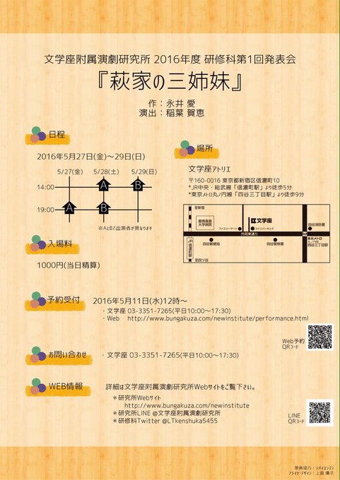 今日は「萩家の三姉妹」Aチームの楽日、Bチームの初日です。今日の19時と明日の14時の回は、まだ予約可能です。チームが変わるとまた違った面白さがあるので、どっちも観て欲しいです(*^o^*)お時間ある方ぜひ!