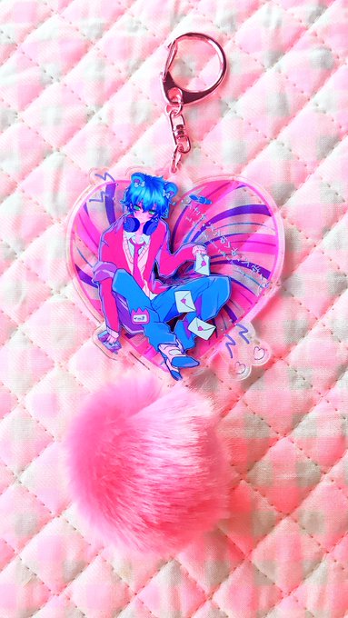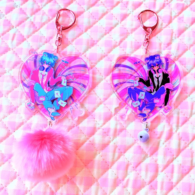 アクキー届きました! 表面保護ありの両面イラスト&ピンクのナスカンにピンクのフェイクファーorパープルのフロッキー鈴の2種 tenten城一周年お楽しみバッグの中には必ずひとつ封入を予定 下北沢のきゃんしろさま、大阪中崎町のtentenさま、WEB通販にて販売お待ちください!