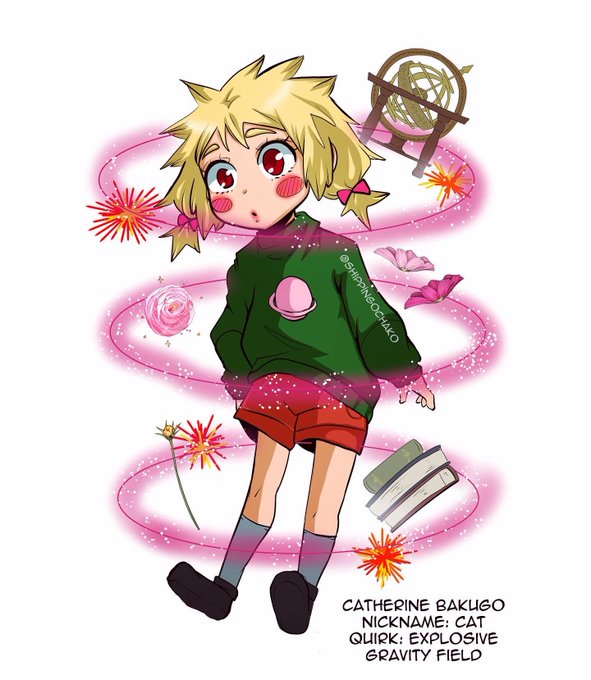 Kacchako Child! Her nickname is Cat (KATsuki, you know? ;)) Her quirk is to have her own gravity field around her and she‘s able to destroy the Things that float around her gravity field with explosions. #kacchako #kacchakochild