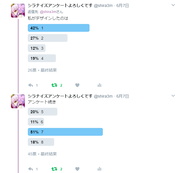 結果出てました!私がデザインしたのは2番の船とともに沈んだ子です! 自分的にはこれはバレバレなのでは…?と思っていたのだけれど実際アンケやってみると下から数えた方が早い投票数でしたね!やったぜ。 沢山の投票ありがとうございました!ちょう楽しかったです!