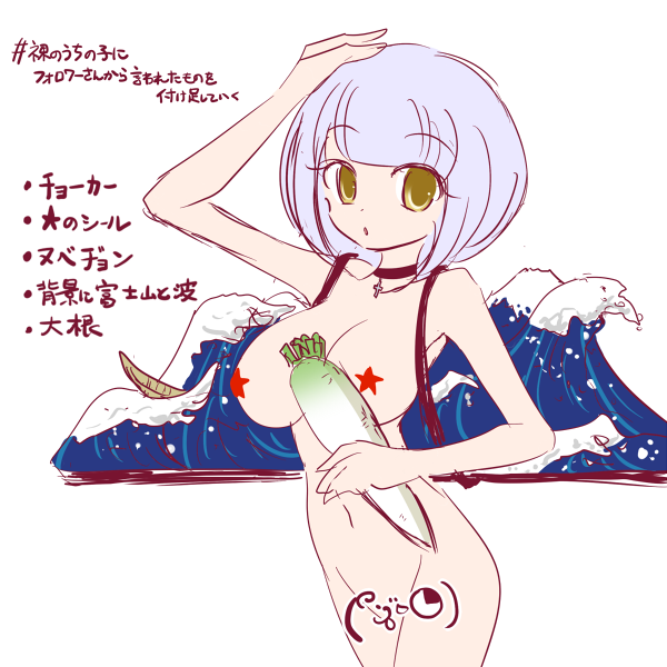 できた~٩( ᐛ )و #裸のうちの子にフォロワーさんから言われたものを付け足していく ・チョーカー ・★のシール ・ヌベヂョン ・背景に富士山と波 ・大根