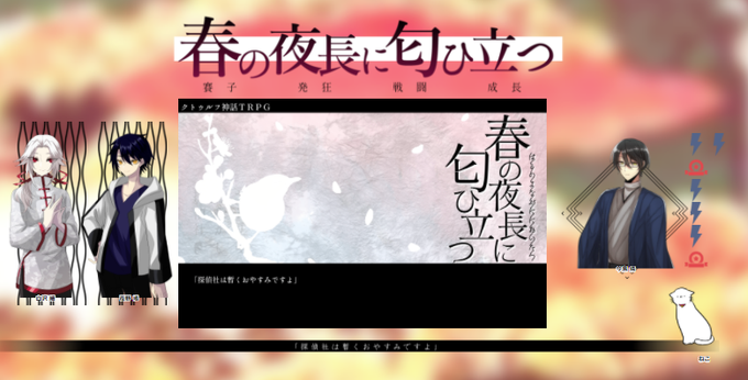 春の夜長に匂ひ立つ(まつげ屋 様)回してきました!ウグウ・・・・・・・・・・・・・・・ 楽しんで頂けたようで何よりですしKPもすごく楽しかった ちょう楽しかったです・・・・・・ それはそうとして出目すごいね君・・・・・ PL紫陽花さんありがとうございました!にゃんこはPicrewより!