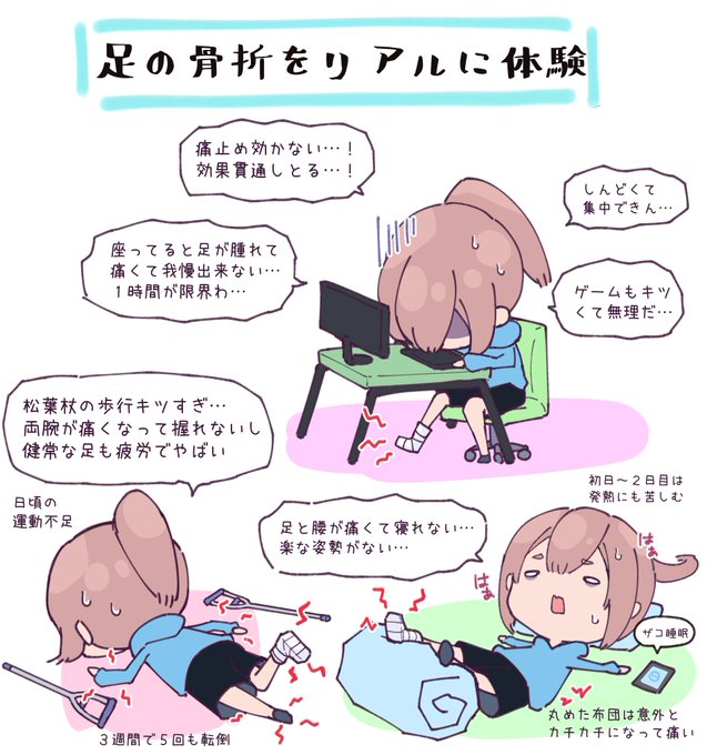🦴初めて骨折を経験した話🦴 様々な誤解をしていました!!!! というイラストです!!!!!! そして自身の体力のなさと弱さを知った🐱 骨折してから25日目ですがまだ歩くに至りません。