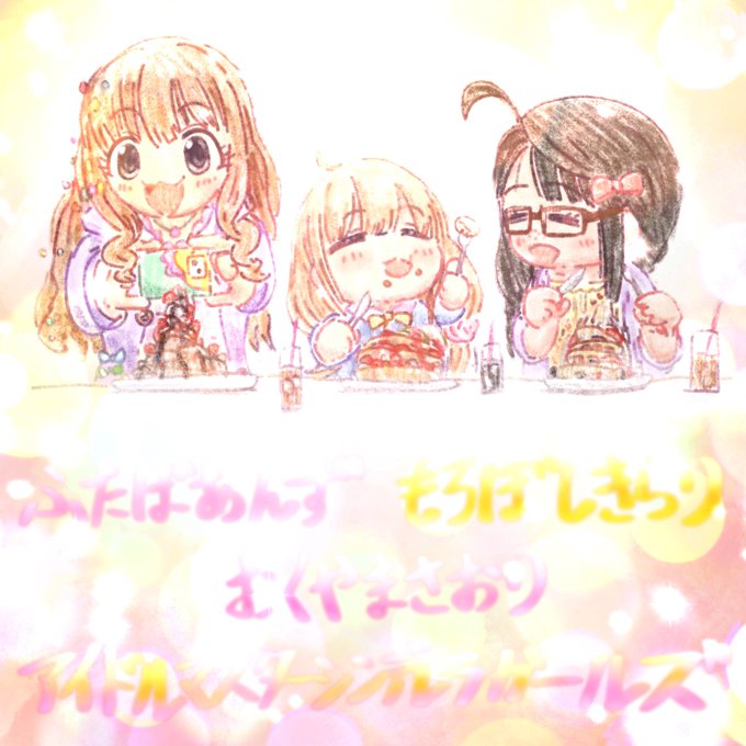 双葉杏ちゃんと諸星きらりちゃんと一緒にパンケーキを食べに来た奥山沙織ちゃんを描きました。 #双葉杏 #諸星きらり #奥山沙織