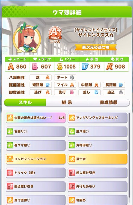かなり引き離して先頭で粘るスズカがいたのでステを見てみたけど、最近流行りのパワー賢さウンス継承スキル型かな? 正直同じデバフ3人全員につけるならいいけど、そうでないならバフスキル詰んだ方が強いよねきっと