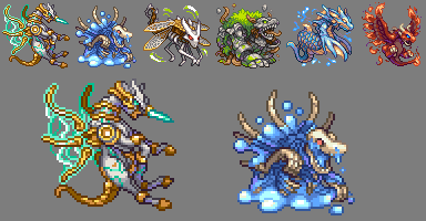 64x64 16色 デフォルメドラゴンドットその5、6体目、ドラゴンスライムと光属性のドラゴン。サイズに慣れてスピードがあがったので2体UP!あとは飽きとの戦い…!