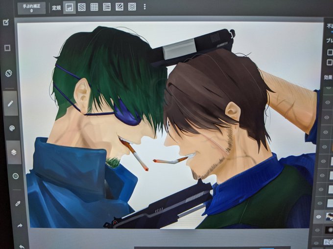 初めは一枚目ので終わろうとしてたけど、スモーキーさんの眼帯の左右と髪の流れる向きの間違いに気づいた。