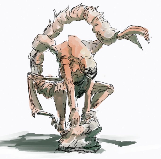 #_模写 12分18秒 これはサソリのクリーチャー?影には緑を足している,中間色が赤みがかっているから。接地面にもう少し重力を足したい