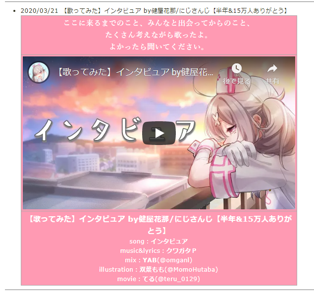 wikiの歌動画装飾埋め込みでふと過去のものを見返したくなったんだけど、ログが消えていくのでそれ用のページを作っておくなど