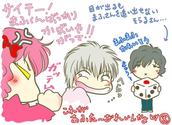 アソビ大全。すごろくみたいなので⑥がなかなか出ずスタートできないまふさんを不憫に思い、まふ駒を追い出せる目を出しながら、それをしないそらるさん。オレだったら行ってるだろ!って怒るなるせちゃんカワユス♡ これがAtRかよ~ホントそれな。 #そらるさん #まふまふさん #なるせさん