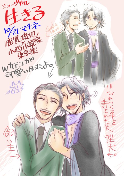 10/27生きるマチネ鹿賀丈史×小西遼生東京楽 Wカテコの鹿賀なべさんと小西小説家さんが可愛いかったんですよ 鹿賀なべさんがはい握手って手出してから一拍の間を置いてがばっと行ったのが本当わんこぽかった…すっごい笑顔だった