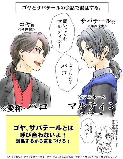 GOYAの感想を色々読んだけれど、これから観劇する方向けに「劇中で説明が一切無いけど、そういうものとして耳に入れておいた方がいい」と思う情報 サパテールはまだしもゴヤとホセーファどっからきたん、誰が誰なのって初日観劇後の皆の感想面白かった←