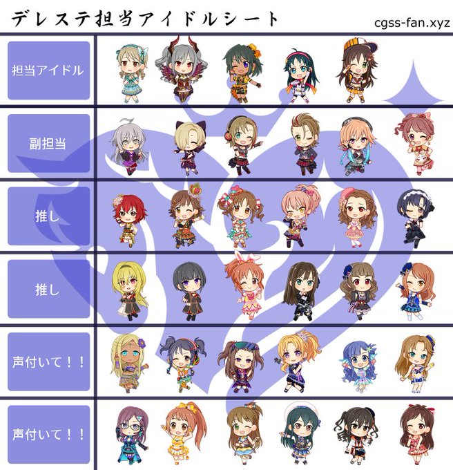 あ、久々に担当シート更新しときますね 副担当とかファンの娘増えてきたな…(主にライブ) 声付いてほしい子いすぎてここにはまとめきれねぇ…