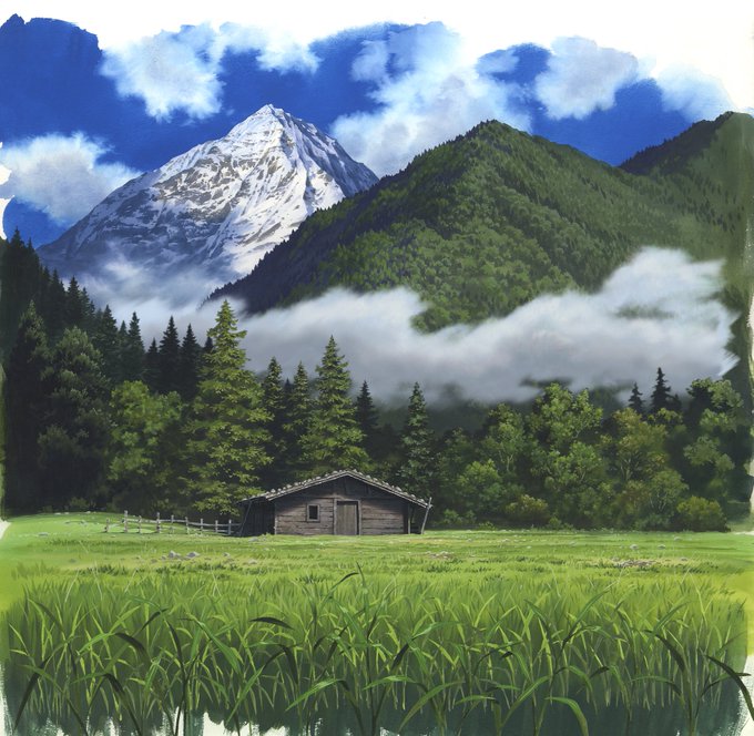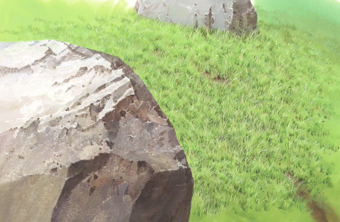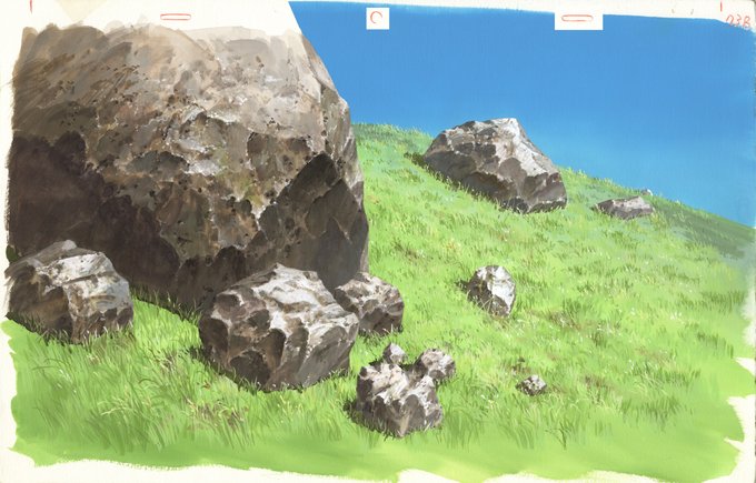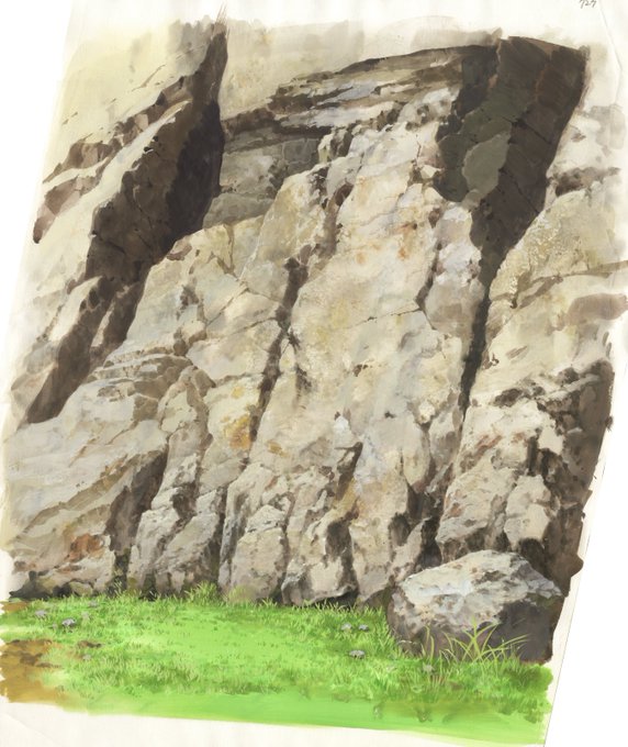 @mk_background は、はやい!!背景描いているのはジブリの人たちや美術監督クラスの人が多いのでとても参考になります!自分は岩場や芝生が苦手なのでその参考としてもいつも見てます!本編だと撮影処理が載るので原画が見れないのが残念です。本当は画集が出れば一番世間にも届くしいいんですけどね。