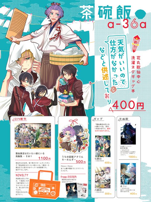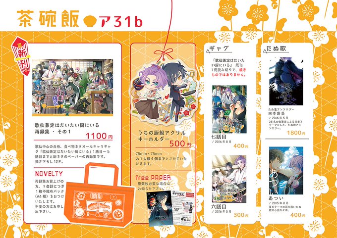 C91 1日目 a-36a 「茶碗飯」 明日のおしながきとアクキー絵とポスターですよろしくお願いします! 再録集のノベ袋だけ少し少なめです 欲しい方早めにお願いします
