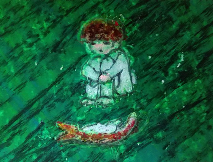 家人にこの絵を見せたら 「笹の葉にのせたおにぎり??🙂」 と言われましたが、横たわってる猫のつもりでした笑 インスタのストーリーに上げたら高校の担任(実はぼく、美術科高校出身です)に「どうした?」と心配されました😅