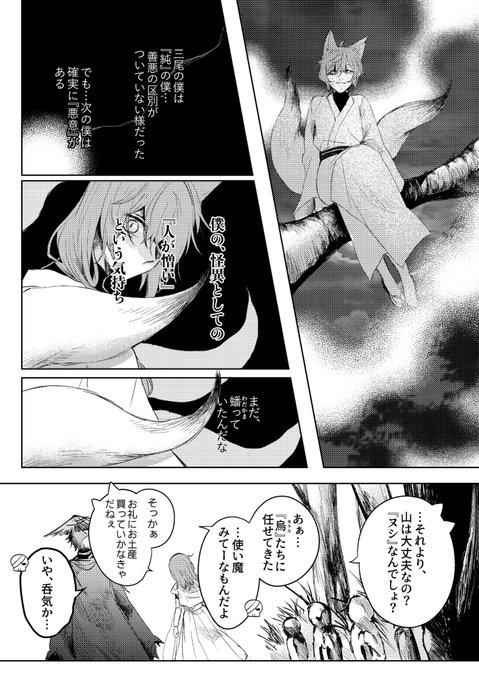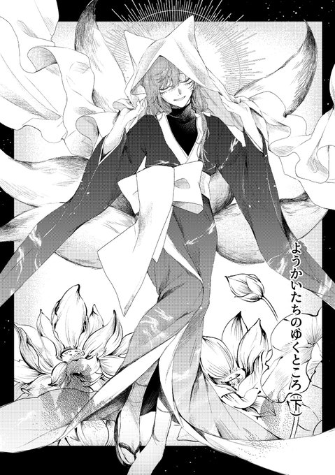 【#にじそうさく10 】 新刊 ようかいたちのゆくところ(下) サンプル(1/7) 分裂した九尾の尾を中心に祓屋と妖怪がわちゃわちゃしてる話です💀🦊 ツリーにアンケートがあります!