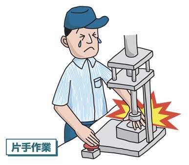 両手を使わなければ機械を操作できないようにする仕組み。両手が"安全な位置"にないと機械が動かないので、事故防止に繋がる。
