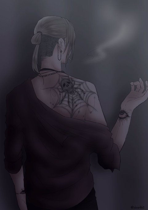 ちょこっと修正したやつ 尚哉の刺青頑張って描いた…_:(´ཀ`」 ∠): まだ幼い頃に親にされた根性焼きの痕を消すために、背中に大きな蜘蛛を もうリスカしないために、両腕にこちらを見つめ返す眼を という意味合いの刺青