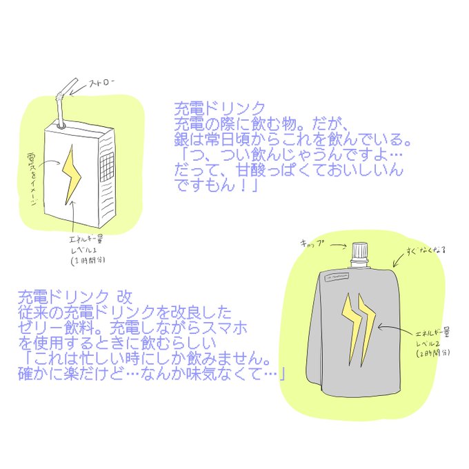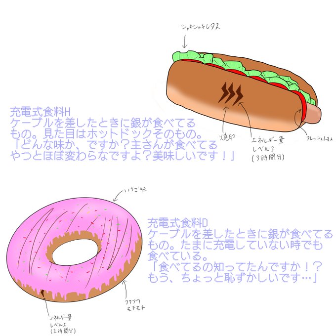 設定画② 銀の充電めし 銀が日頃の充電の際や、何もしてない時に飲食しているものを描きました。 サイバーウイルスにかかったときお薬も…💊💊💊 #設定画
