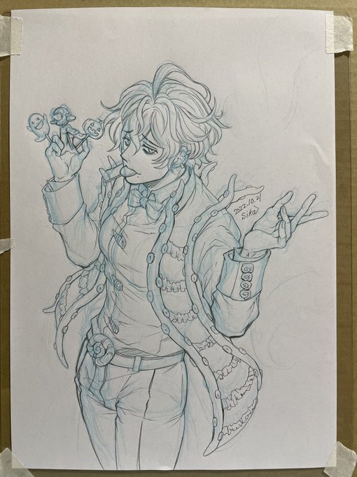 ハロウィンドモンくん沢山見てもらえて嬉しいです🎃ありがとうございます✨タイムプラスと一緒に上げればよかった途中経過 アナログの下絵→スマホで取り込んだ後の線画調整→塗り分け